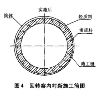 經(jīng)過與原料廠家、大修部門對(duì)該問題的共同探討,較確定將原有兩條澆注料之間的直縫施工修改為有錯(cuò)臺(tái)的施工縫,阻擋在高溫條件下高溫炭粉由施工縫進(jìn)入輕質(zhì)料層�;剞D(zhuǎn)窯內(nèi)襯新施工簡(jiǎn)圖見圖4。此項(xiàng)措施較明顯地改善了內(nèi)襯的使用狀況,次采用就使回轉(zhuǎn)窯內(nèi)襯的使用壽命提高到了440天以上。